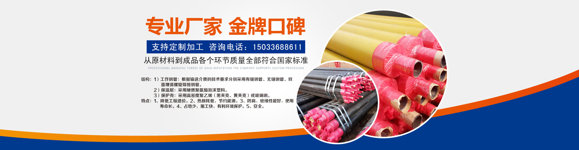 河北興松實業有限公司主營:預制直埋保溫管,鋼套鋼直埋保溫管,預制鋼套鋼保溫管,預制直埋熱水保溫管(件),預制直埋蒸汽保溫管(件),預制架空聚氨酯鍍鋅保溫管.公司自成立至今始終堅持技術領先、服務到位的產品宗旨,建立了一支由高素質的專業技術人員和企業管理人員構成的企業運營團隊。我公司從國內外引進了大批先進的生產、檢驗設備,使企業的生產能力、生產規模、技術保障與質量控制水平始終居于國內同行業前列。